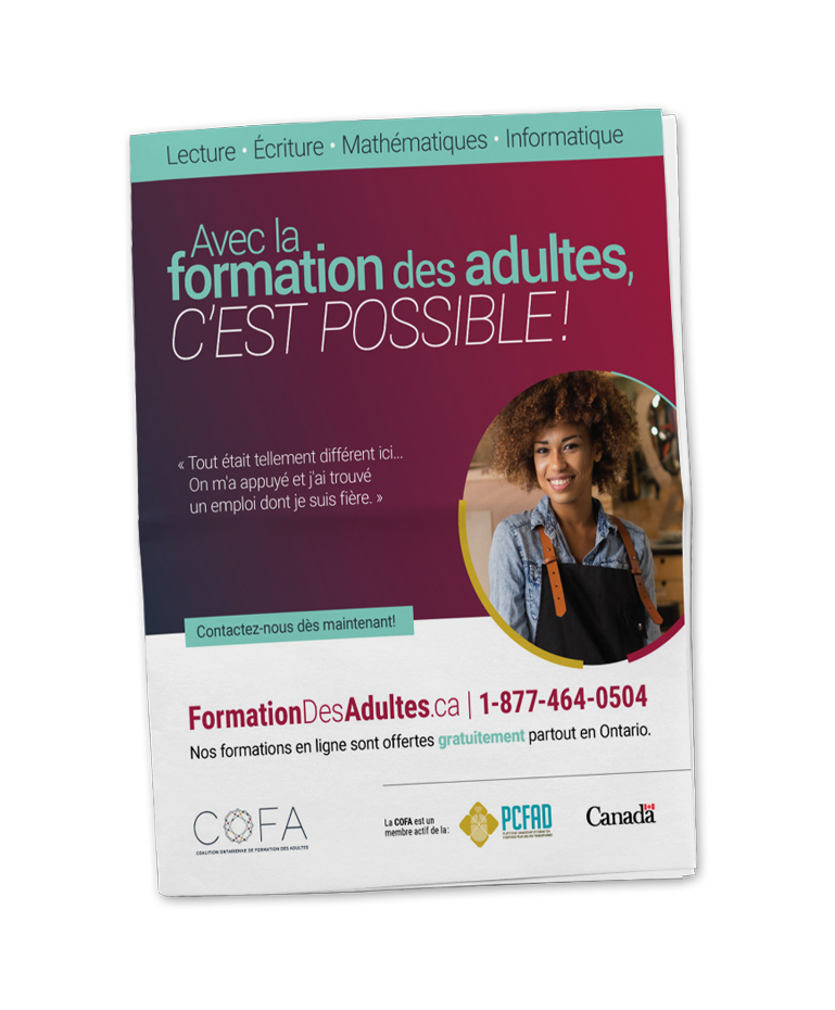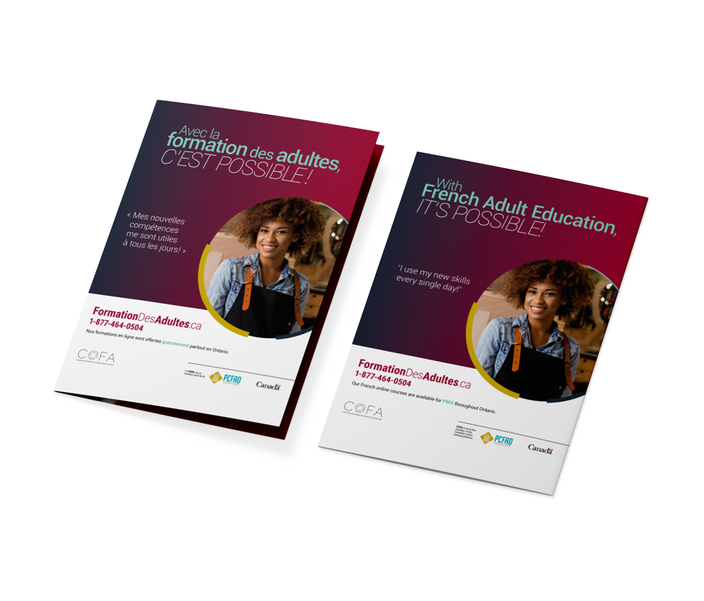 Afin de répondre au besoins variés des membres de la COFA, situés sur tout le territoire de l’Ontario, Chabo a développé une boite à outils versatiles offrant des moyens de promotion pertinents tant en milieu rural qu’urbain. De plus, cette boite à outils a évoluée afin d’également répondre aux besoins des partenaires francophones d’autres provinces canadiennes qui de sont ajoutés dans une deuxième phase.